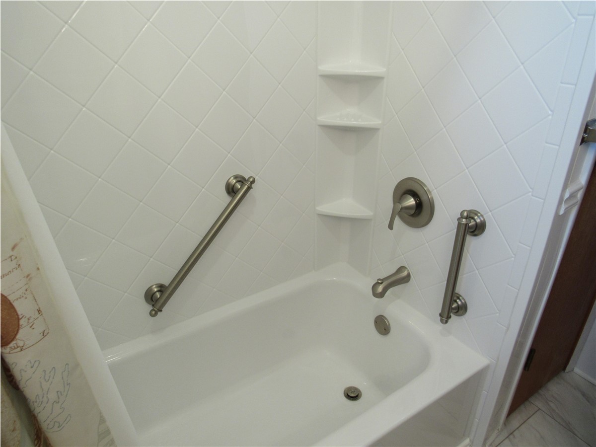 We remodeled the bathing area in 2 bathrooms for a customer in Lafayette, Indiana. For the bathtub replacement, customer chose a low-maintenance subway tile wall pattern with Listello trim, matching corner shower caddies, and grab bars/plumbing fixtures/shower curtain rod in a brushed nickel finish.